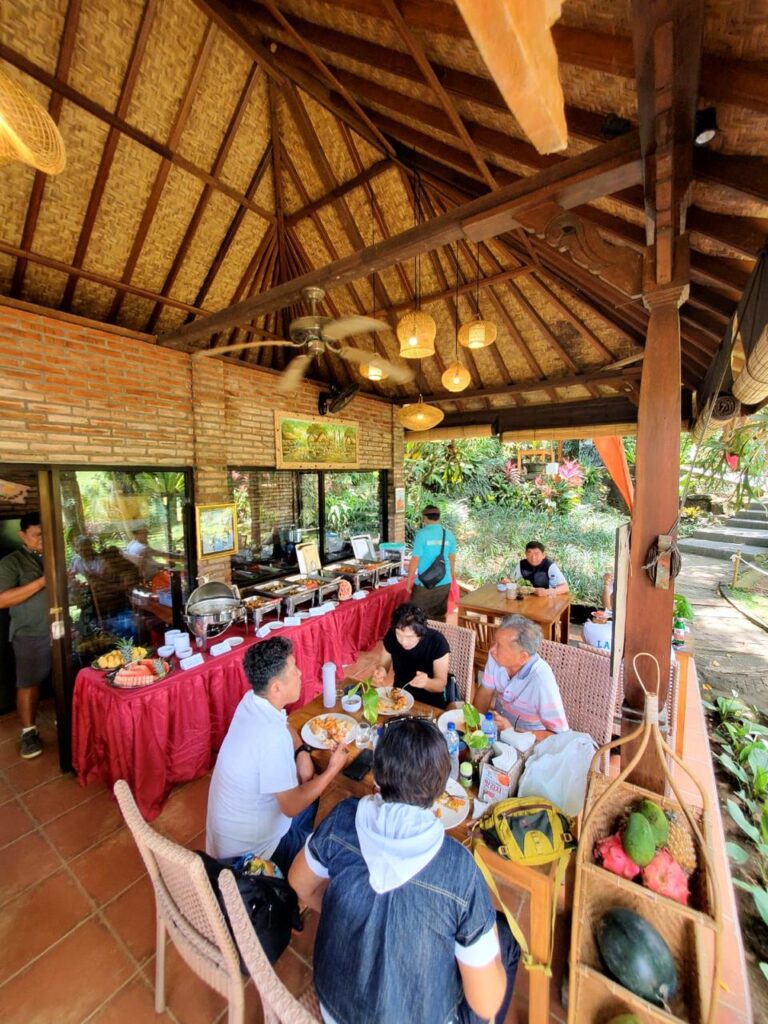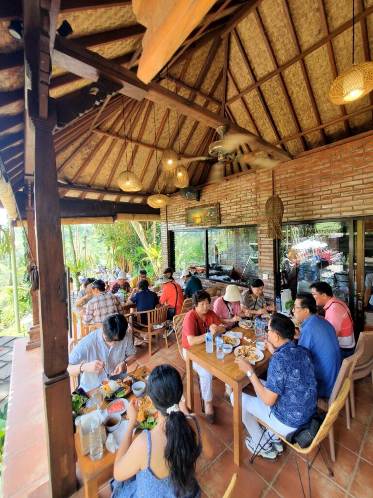 After exploring the attractions, the riverside restaurant offers a tranquil space influenced by Balinese design and open-air comfort. Bamboo accents, garden views, and natural surroundings create a welcoming dining environment.